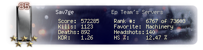 | Headshots | 103 | Suicides | 40 | Headshot / Kill | 10.76 % |
