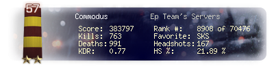 | Headshots | 167 | Suicides | 10 | Headshot / Kill | 21.89 % |