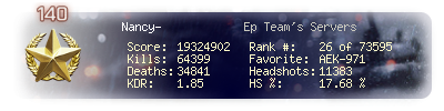 | Headshots | 1758 | Suicides | 143 | Headshot / Kill | 15.32 % |
