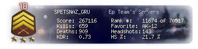 | Kills | 659 | Deaths | 909 | Kill / Death | 0.73 |