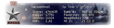 | Headshots | 494 | Suicides | 11 | Headshot / Kill | 20.56 % |