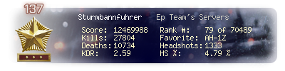 | Kills | 27804 | Deaths | 10734 | Kill / Death | 2.59 |