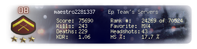 | Headshots | 43 | Suicides | 1 | Headshot / Kill | 17.7 % |