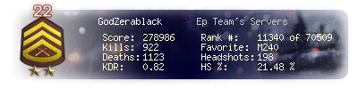 | Headshots | 198 | Suicides | 18 | Headshot / Kill | 21.48 % |