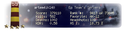 | Headshots | 32 | Suicides | 11 | Headshot / Kill | 22.07 % |
