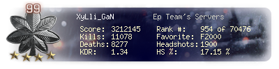 | Kills | 11078 | Deaths | 8277 | Kill / Death | 1.34 |