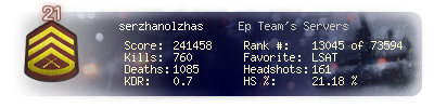 | Headshots | 62 | Suicides | 4 | Headshot / Kill | 19.81 % |