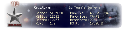 | Headshots | 717 | Suicides | 58 | Headshot / Kill | 15.53 % |