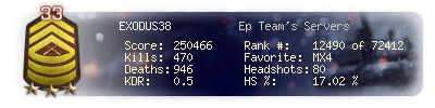 | Headshots | 80 | Suicides | 4 | Headshot / Kill | 17.02 % |