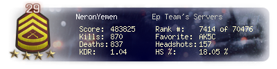 | Headshots | 118 | Suicides | 1 | Headshot / Kill | 17.96 % |