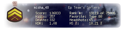 | Headshots | 65 | Suicides | 6 | Headshot / Kill | 18.21 % |