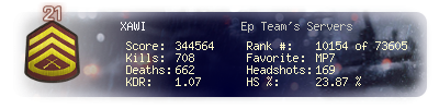 | Headshots | 169 | Suicides | 21 | Headshot / Kill | 23.87 % |