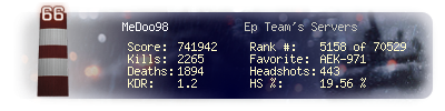 | Headshots | 443 | Suicides | 6 | Headshot / Kill | 19.56 % |