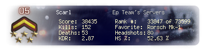 | Headshots | 80 | Suicides | 10 | Headshot / Kill | 52.63 % |