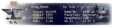 | Headshots | 225 | Suicides | 36 | Headshot / Kill | 14.97 % |