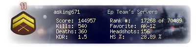 | Headshots | 156 | Suicides | 3 | Headshot / Kill | 28.89 % |