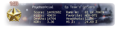 | Kills | 49630 | Deaths | 14764 | Kill / Death | 3.36 |