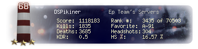 | Headshots | 304 | Suicides | 36 | Headshot / Kill | 16.57 % |