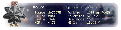 | Headshots | 1053 | Suicides | 79 | Headshot / Kill | 18.03 % |