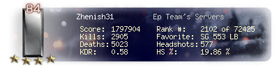 | Headshots | 577 | Suicides | 72 | Headshot / Kill | 19.86 % |