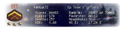 | Headshots | 14 | Suicides | 1 | Headshot / Kill | 17.28 % |