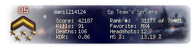 | Headshots | 12 | Suicides | 1 | Headshot / Kill | 13.33 % |