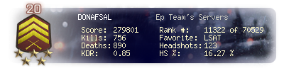 | Headshots | 123 | Suicides | 15 | Headshot / Kill | 16.27 % |