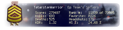 | Headshots | 127 | Suicides | 5 | Headshot / Kill | 31.99 % |