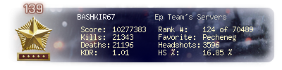 | Headshots | 3536 | Suicides | 249 | Headshot / Kill | 16.77 % |