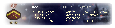 | Headshots | 7 | Suicides | 3 | Headshot / Kill | 9.33 % |