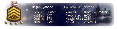 | Headshots | 236 | Suicides | 10 | Headshot / Kill | 29.24 % |
