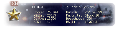 | Headshots | 118 | Suicides | 6 | Headshot / Kill | 14.81 % |
