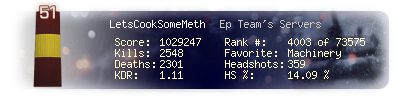 | Headshots | 359 | Suicides | 26 | Headshot / Kill | 14.09 % |