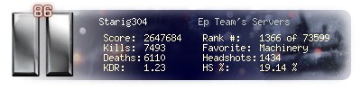 | Headshots | 1434 | Suicides | 93 | Headshot / Kill | 19.14 % |