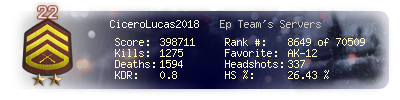 | Headshots | 337 | Suicides | 18 | Headshot / Kill | 26.43 % |