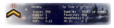 | Headshots | 0 | Suicides | 0 | Headshot / Kill | 0 % |