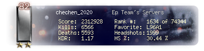 | Headshots | 1259 | Suicides | 65 | Headshot / Kill | 33.95 % |