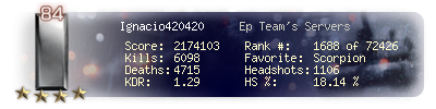 | Headshots | 296 | Suicides | 15 | Headshot / Kill | 20.4 % |