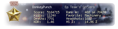| Kills | 11240 | Deaths | 7701 | Kill / Death | 1.46 |