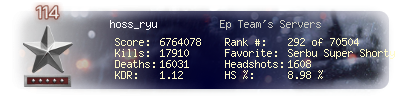 | Headshots | 653 | Suicides | 186 | Headshot / Kill | 7.21 % |