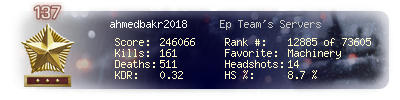 | Headshots | 14 | Suicides | 6 | Headshot / Kill | 8.64 % |