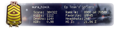 | Headshots | 244 | Suicides | 7 | Headshot / Kill | 21.94 % |
