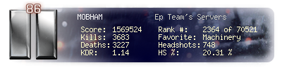 | Headshots | 561 | Suicides | 31 | Headshot / Kill | 20.58 % |