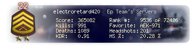 | Headshots | 201 | Suicides | 6 | Headshot / Kill | 20.28 % |