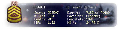 | Headshots | 137 | Suicides | 11 | Headshot / Kill | 22.64 % |