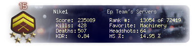 | Headshots | 46 | Suicides | 8 | Headshot / Kill | 13.57 % |