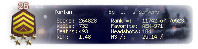 | Headshots | 169 | Suicides | 9 | Headshot / Kill | 25.34 % |