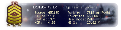 | Headshots | 291 | Suicides | 12 | Headshot / Kill | 25.62 % |