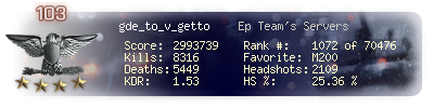 | Headshots | 1697 | Suicides | 34 | Headshot / Kill | 25.76 % |