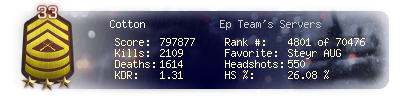 | Headshots | 550 | Suicides | 8 | Headshot / Kill | 26.08 % |
